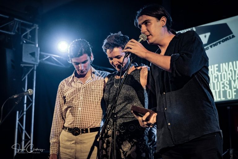 Blues chanteuse Kerri Simpson inducted Chris Wilson, voted the 2019 People’s Choice, with an impassioned tour de force of the great man’s musical exploits. The late musician was remembered for his powerful singing and harmonica performances, as well as his song writing ability in the country and blues field. Wilson’s wife Sarah, and sons Fenn and George accepted the award appreciating the enduring recognition.