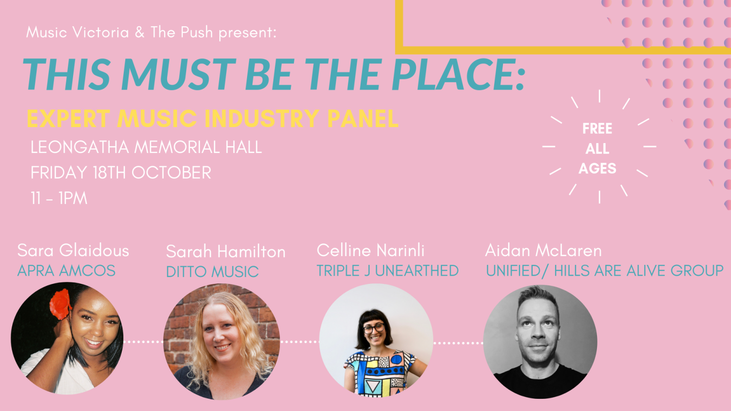 Are you in need of some guidance or want to know the music services that are available to you? Lou James (THE PUSH) and Ash Bartlett (MUSIC VICTORIA) will moderate this exciting panel discussion featuring recognised music industry professionals Cellini Narinli (TRIPLE J UNEARTHED), Sarah Hamilton (DITTO MUSIC), Sara Gladious (APRA AMCOS) & Aidan McLaren (UNIFIED / HILLS ARE ALIVE GROUP). Take this opportunity to ask these industry professionals some questions, and stick around for friendly networking over lunch after the panel.