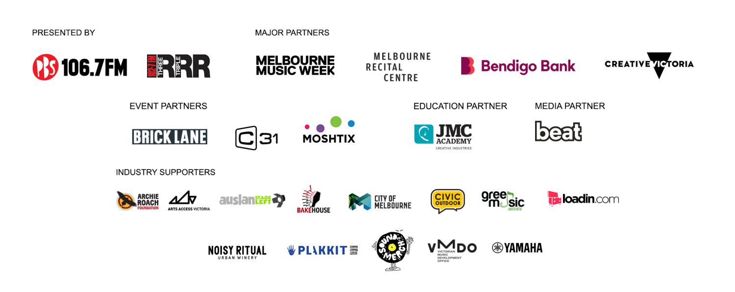 Music Victoria thanks Major Partners Bendigo Bank, City of Melbourne, Creative Victoria and Melbourne Recital Centre, and Event Partners Brick Lane, Channel 31 and Moshtix for their ongoing support of the Music Victoria Awards.
